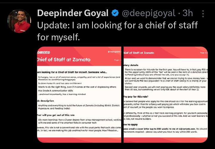 By presenting the Chief of Staff role as a learning experience rather than a traditional job, Goyal is challenging conventional ideas of professional growth in corporate India, positioning this opportunity as one for those willing to invest in their learning and contribute to shaping the future of the company.