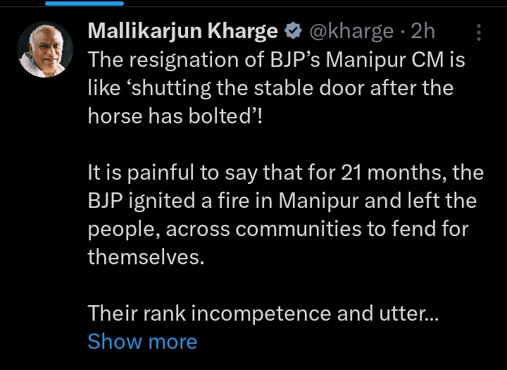 Congress president Mallikarjun Kharge compared Singh’s resignation to “shutting the stable door after the horse has bolted,” pointing to the prolonged violence and turmoil in the state. He criticized the Modi-led BJP government for its handling of the Manipur crisis, accusing it of “disdain and apathy.”