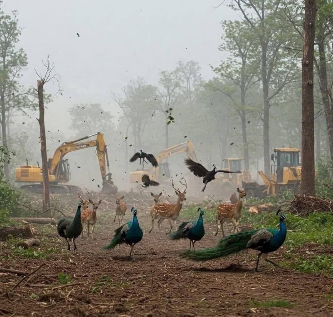 A video circulating on social media shows the haunting cries of birds, particularly peacocks, as bulldozers and JCB machines tear through the forest, leaving behind a barren landscape. The emotional sound of the birds has stirred widespread concern, with many criticizing the act as a reckless disregard for nature and wildlife. KT Rama Rao, a prominent political figure, shared the video on X (formerly Twitter), calling the destruction of the forest a “brazen green murder.” He condemned the government for destroying 400 acres of what he described as “precious lung space” in western Hyderabad, highlighting the plight of the peacocks crying out for help.